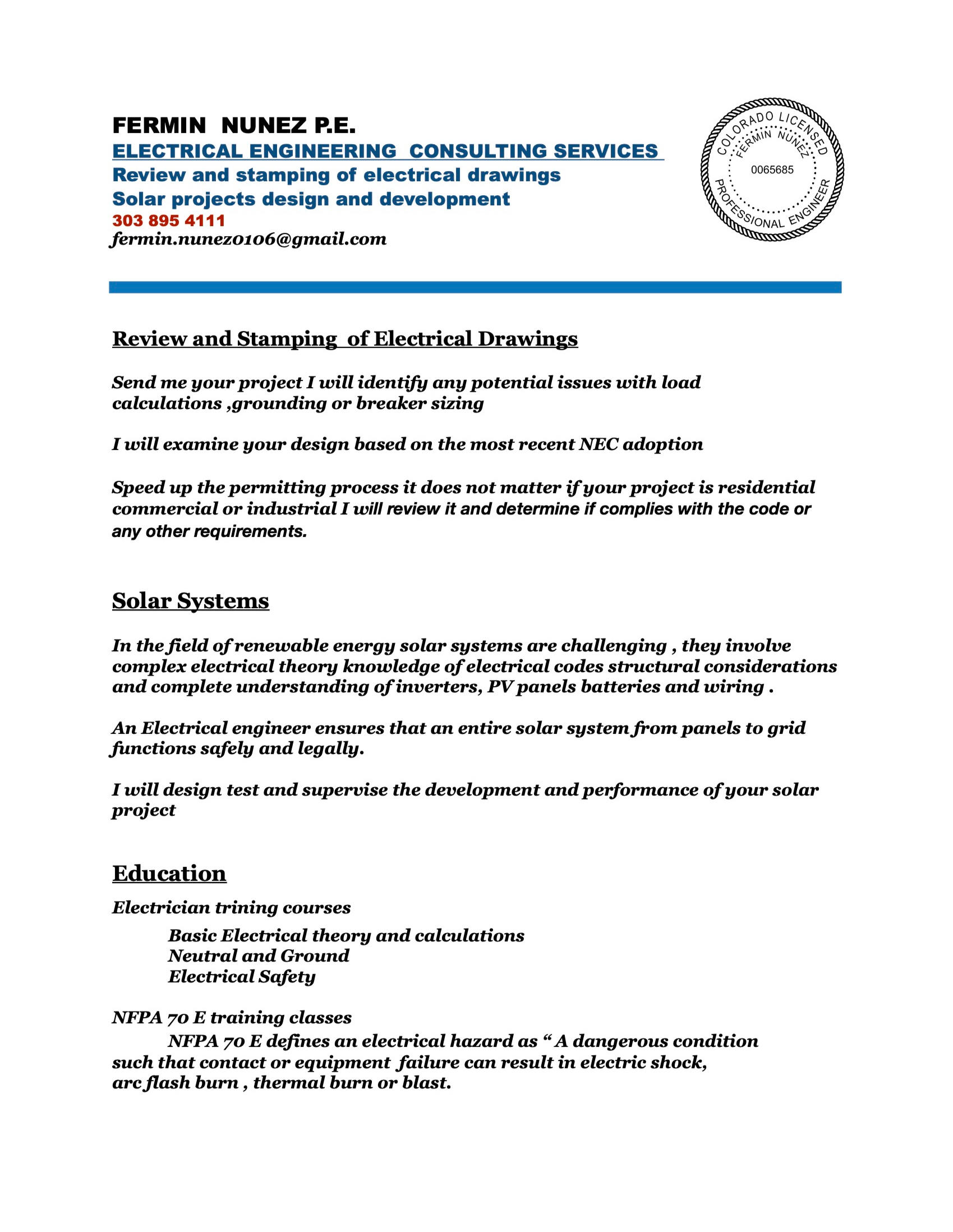 * Review and stamping of electrical documentation for electrical permit* Design calculation and supervision of solar systems* Electrical Safety training courses303 895 4111 [email protected]